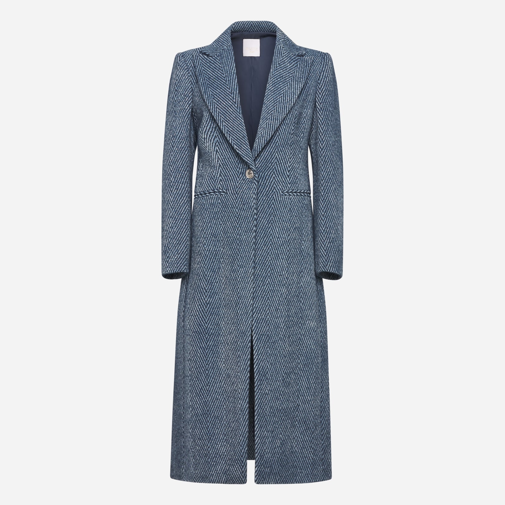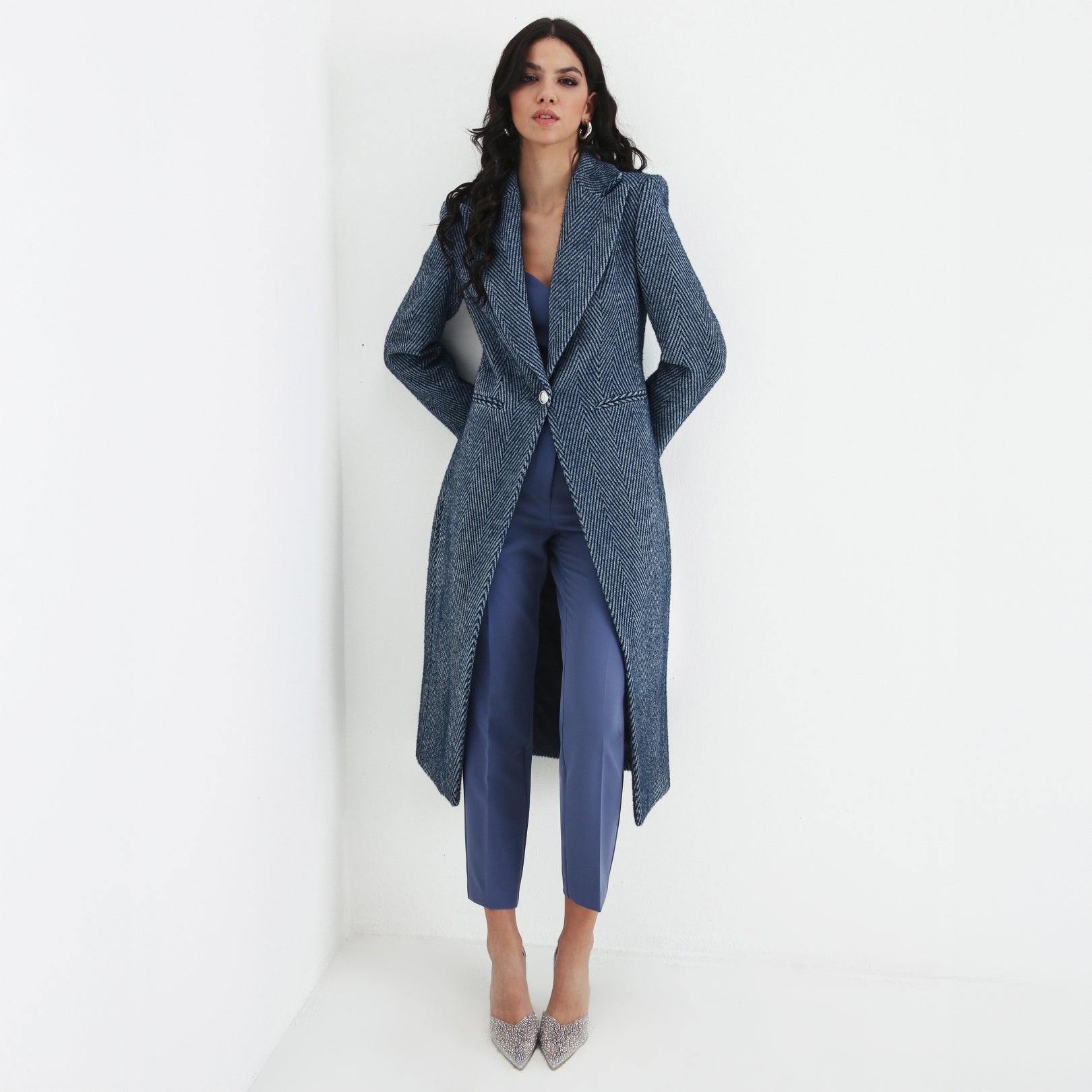 Elegante e sofisticato, questo cappotto lungo è realizzato in un pregiato tessuto spigato nelle tonalità del blu. La silhouette strutturata con revers ampi e chiusura monopetto con bottone singolo valorizza la figura, conferendo un’eleganza contemporanea e senza tempo. Le linee pulite e il taglio sartoriale ne fanno un capo versatile, perfetto sia per look formali che per outfit più casual-chic. Un capo essenziale per la stagione fredda, ideale per completare il guardaroba con stile e raffinatezza.