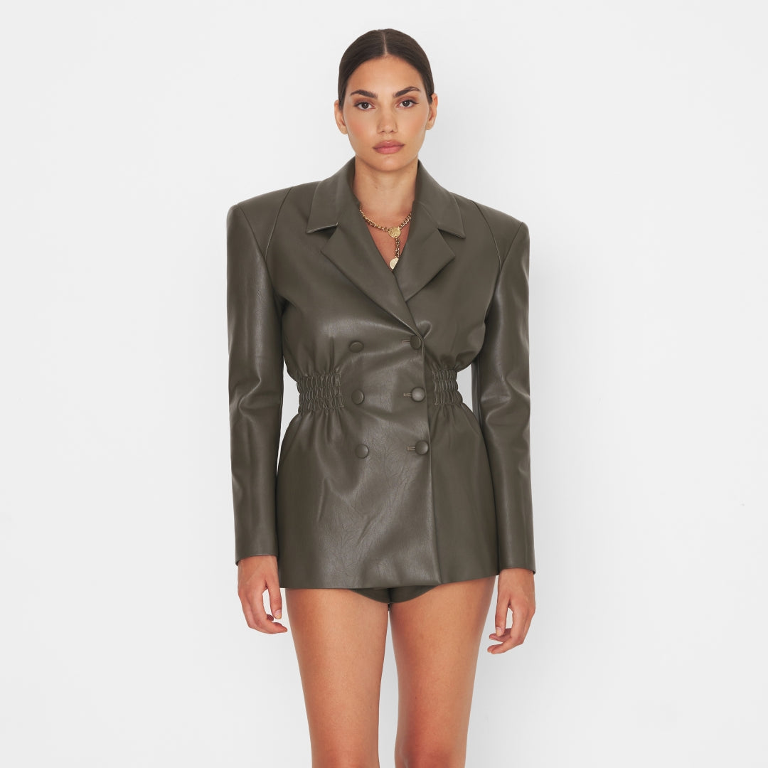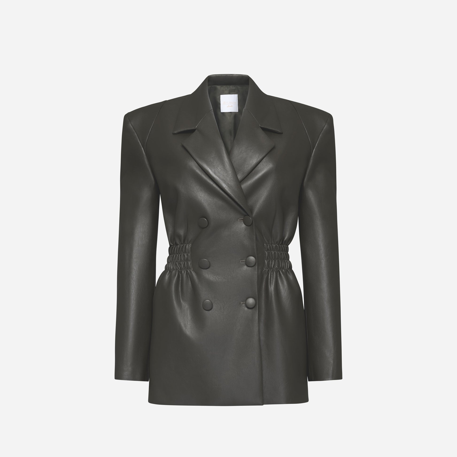 Un capo iconico e dal carattere deciso, perfetto per aggiungere un tocco sofisticato e contemporaneo al guardaroba. Questo blazer in eco pelle è realizzato con una linea strutturata che valorizza la figura e dona un’eleganza senza tempo.